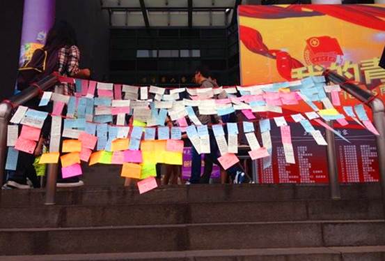 在这满眼的祝福贴中,有对学长学姐曾经提供帮助的感谢,“一直记得你们教我的那句‘不忘初心,方得始终’,你们永远是新传的骄傲!”2011级的苏煜雅这样写道。有对未来贴心的祝愿,“学长学姐毕业快乐!离开学校也要常回家看看,未来的路加油!”2012级的刘鹏宇同学这样说。从保研升学到工作就业,从梦想激励到感情祝愿,来自学弟学妹的祝福几乎涵盖了方方面面,正如2013级的冯一迪说的那样“毕业不是结束,而是新的轮回,不论是继续读研还是出国,希望学长学姐们的人生愈加精彩!”每一张字条上的娟秀字迹,每一份祝福下的浓浓情意,都是学弟学妹对即将离开学校的学长学姐们最诚挚的祝愿。