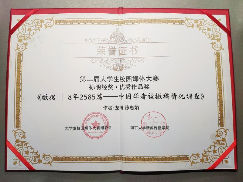 18级本科生龙盼、陈惠娟同学报道《数据 | 8年2585篇——中国学者被撤稿情况调查》荣获数据新闻类奖项,南京大学外国语学院16级西班牙语系本科生储菁报道《养蜂人的困局与突围》荣获深度报道类奖项。